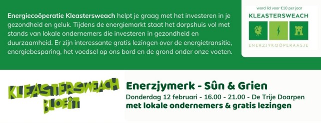 Donderdag 12 februari organiseert Energiecoöperatie Kleastersweach samen met de gemeente, een markt gericht op duurzaam wonen en leven. De markt biedt stands van lokale ondernemers en lezingen over energiebesparen, energietransitie, gezonde voeding en welzijn. Van 16.00 tot 21 uur is de markt in De Trije Doarpen open voor iedereen uit de regio. De markt is onderdeel van de Bloei-week die de coöperatie van 8 tot 15 februari organiseert in Kollumersweach en Feankleaster.